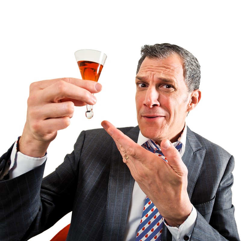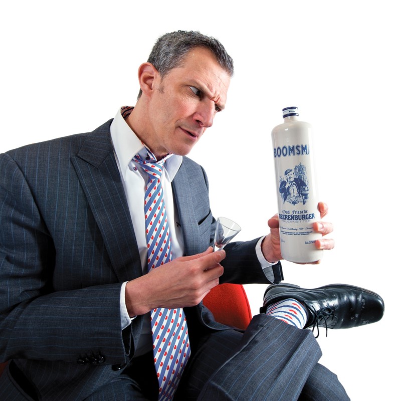 Portret van Greg Shapiro met een typisch Fries product (zoals Boomsma jenever) dat zowel in de show als tijdens de 'masterclass' wordt behandeld.