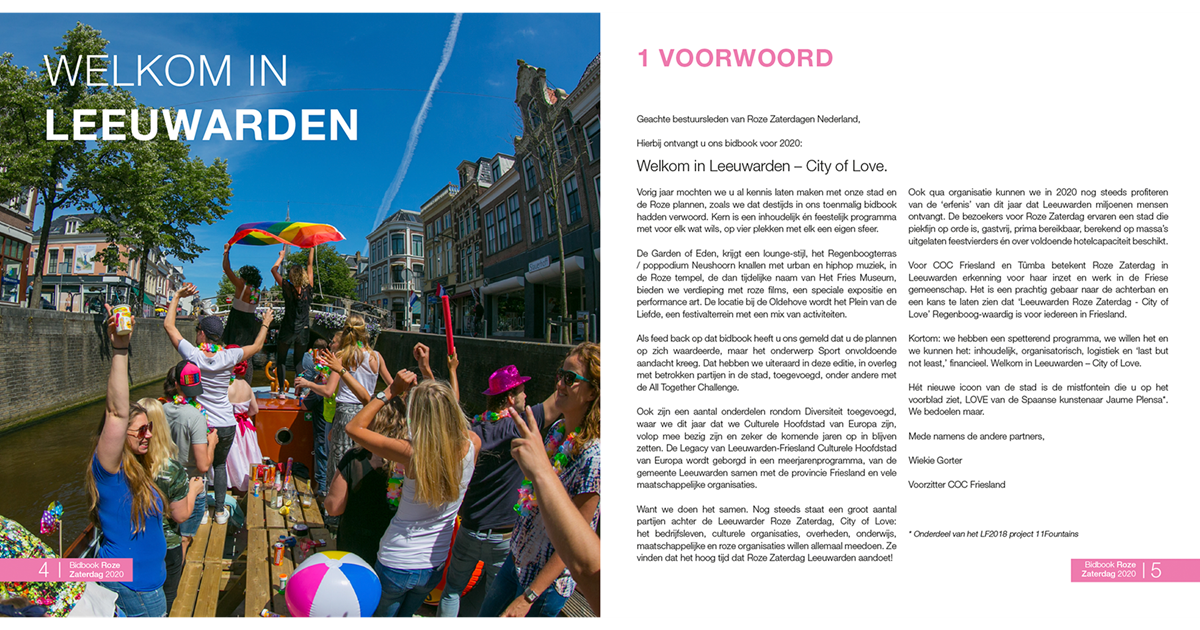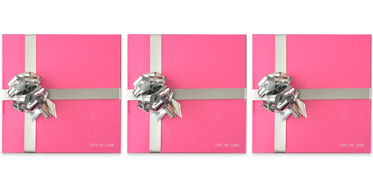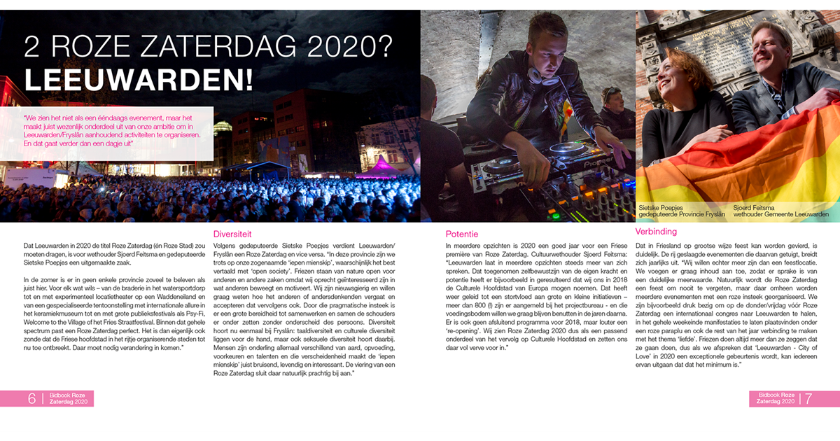 Bidboek roze zaterdag. 21x21 cm gevat in een roze cassette bekleed met linnen.
